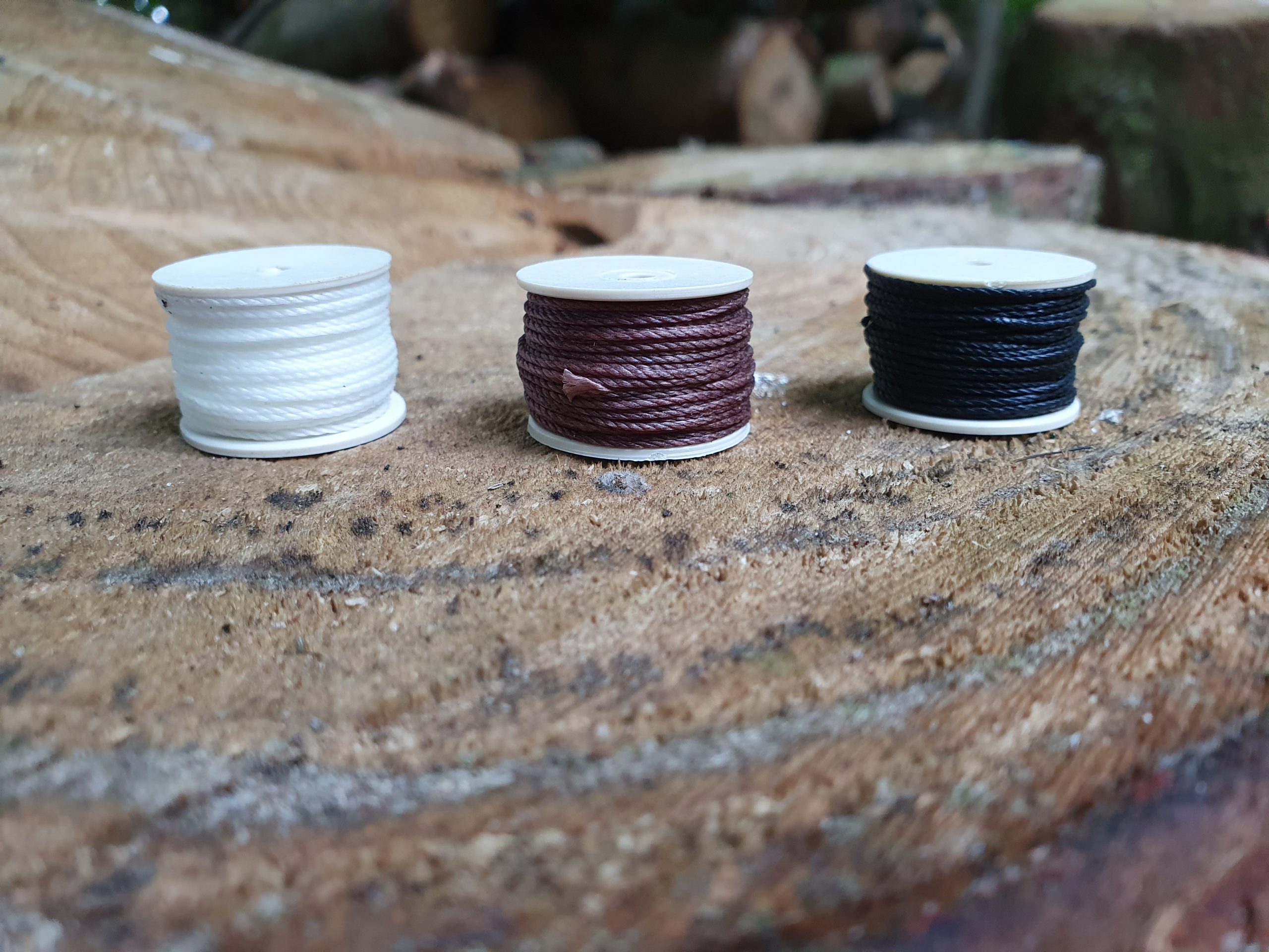 Tråd til håndsymaskinen fåes i følgende farver: Hvid, Sort & Brun.
