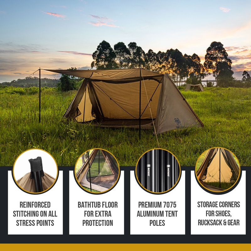 Outback Retreat er et alsidigt telt/shelter som giver sikker ly og vind/vejr og insekter, men stadig giver følelsen af at sove uner åben himmel. Teltet har hele 4 indgange og begge sider på teltet kan åbnes op, så det udgør et "halvtag" over teltet.